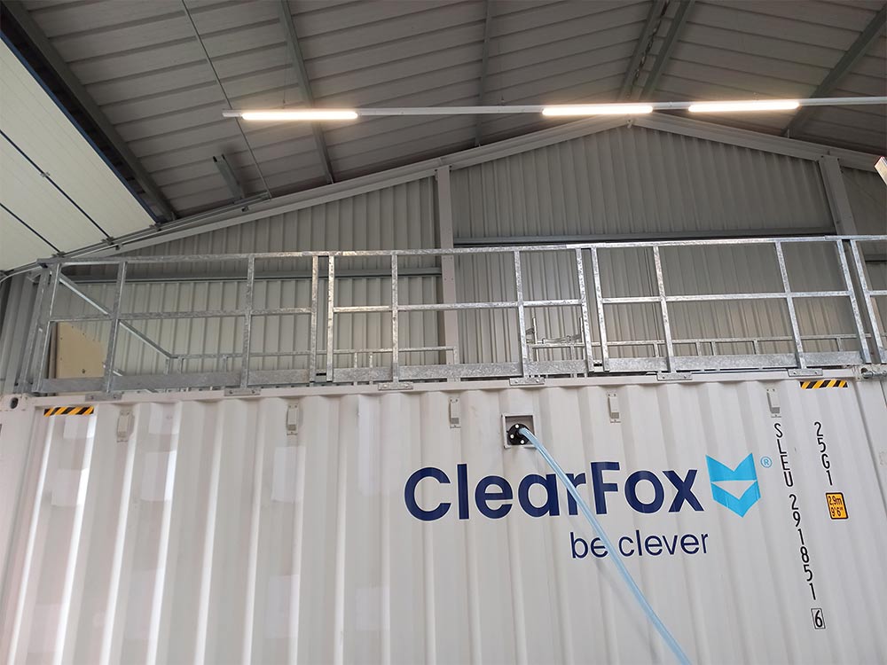 Wastewater is treated using the tried-and-tested ClearFox® FBBR process. The entire wastewater treatment plant was installed in two 20-foot ISO sea containers. The first container contains an aerated buffer tank and a fixed-bed biological reactor for cleaning to effluent class C. The second container contains another fixed-bed biological reactor for further cleaning to effluent class N, a lamella clarifier, a sludge collection tank, a UV disinfection system and the central control unit.