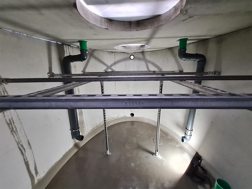The customer wanted the ClearFox® Nature technology in a concrete tank, as this is particularly well suited for underground installation. The ClearFox® team installed the process technology in this concrete tank. They used the drawings they received from the customer to plan the planned pipelines in the best possible way.