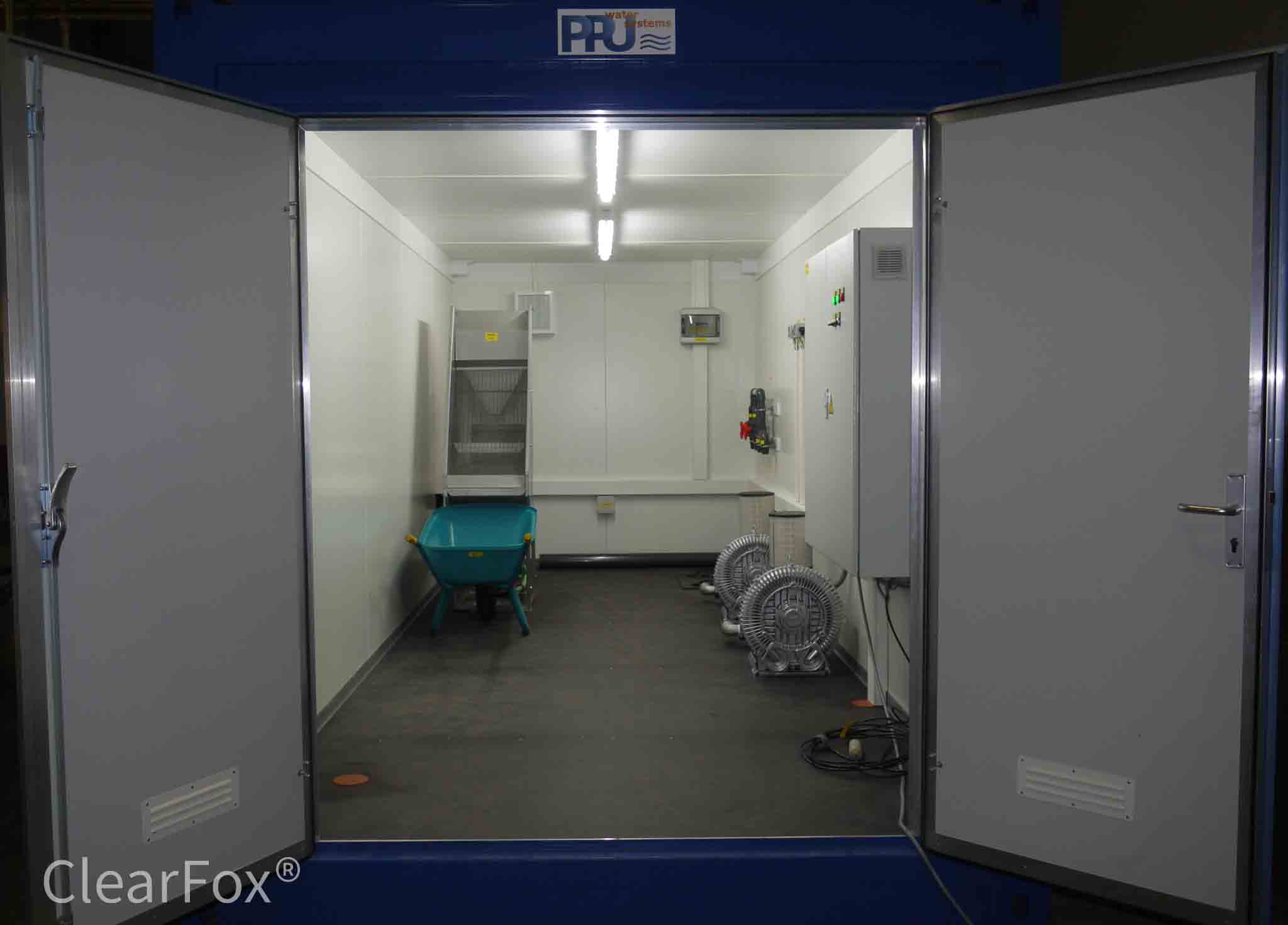 The water will be ventilated with the blowers (V1, V2) in the reactors with reduced power while the water level in the buffer (BU) is constantly measured. After reaching the minimum water level, the control unit will switch directly into the normal cycle.
