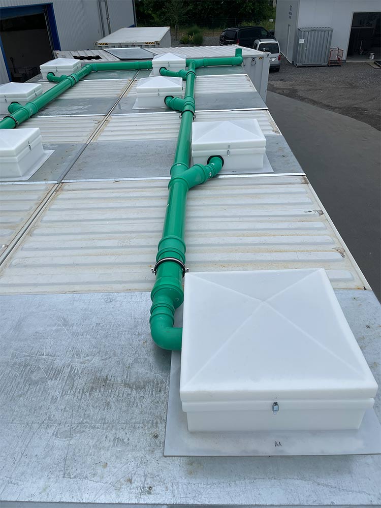 The entire process is installed in the containers. The entire system is installed in a 20-foot and a 40-foot sea container. The 40-foot container consists of four chambers, one of which serves as a buffer tank, while the fixed-bed process is installed in the other three chambers. The 20-foot container contains a lamella clarifier and the control technology.