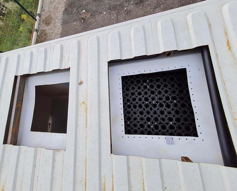 To meet the client’s needs, the ClearFox® team offered a containerised treatment plant with a submerged fixed bed. This was initially available as a leasing system with a purchase option after six months. The fixed-bed container consists of three cascades through which the wastewater flows. With each cascade, the growth area of the fixed-bed material increases – from 100 m²/m³ to 150 m²/m³ to 200 m²/m³. A submersible pump conveys the wastewater from the pump sump into the container treatment plant and from there into the aerated secondary clarifier.